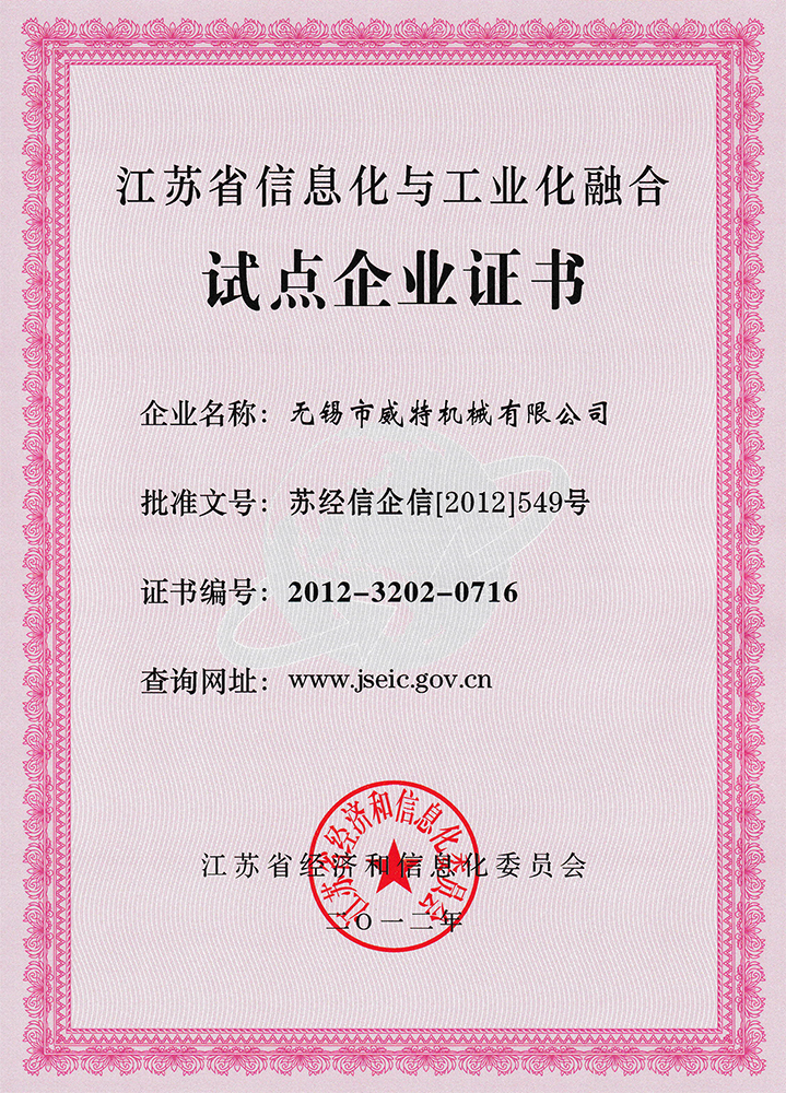 兩化融合試點企業證書